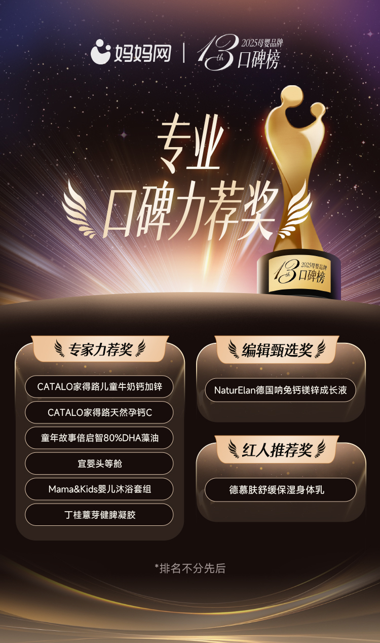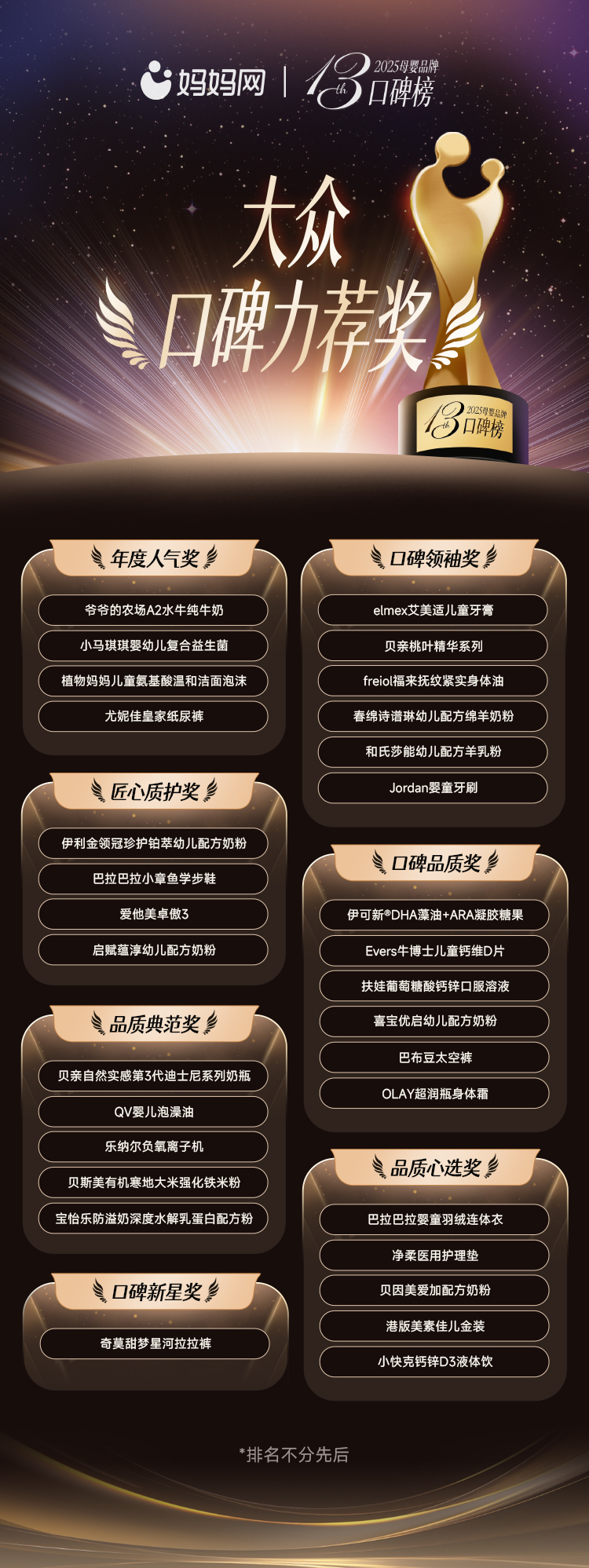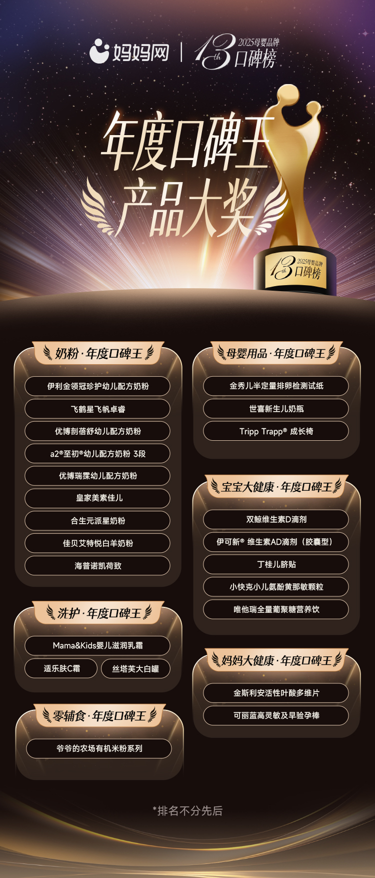 媽媽網母嬰品牌口碑榜始終堅信,真實用戶口碑是衡量產品價值的最終標準。期待這份凝聚了萬千家庭信任的懷孕育兒必備榜單,能夠為您孕育路上的得力參考。未來,媽媽網將繼續攜手所有獲獎品牌與機構,凝聚口碑力量持續前行,共同守護中國家庭的幸福成長旅程!