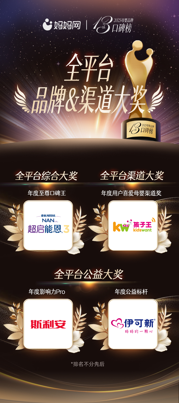 本次揭曉的榜單,囊括了全平臺品牌&渠道大獎、年度口碑王產品大獎、大眾口碑力薦獎、專業口碑力薦獎、服務機構年度大獎五大權威榜單。每一份榮譽的背后,都是對品牌產品力、服務力與用戶口碑力的綜合肯定。這不僅僅是一次評選結果的發布,更是一次母嬰行業盛事,也是對母嬰消費升級趨勢的深刻洞察與引航。